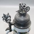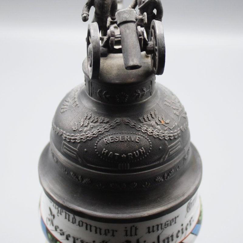 Zinndeckel mit Haubitze / div. Inschriften/Sprüche - Reservist bei Haubitze oben hat leider Kopf weg