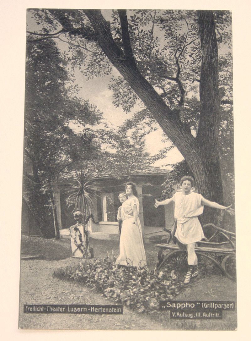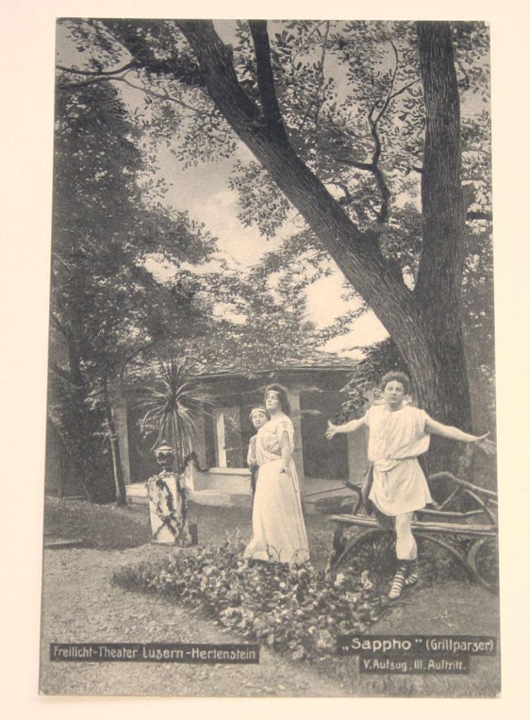 «Das Hertensteiner Freilichttheater entführte die Besucherinnen und Besucher in die Welt der griechischen Mythologie», schreibt Roedig. Direktor war der Berliner Schauspieler und Regisseur Rudolf Lorenz. Es war die Zeit der Belle Epoque und mit ihr der ersten Hochkonjunktur des Luzerner Tourismus. Mit kulturellen Anlässen wollte man in Luzern und Umgebung zusätzlich Feriengäste anlocken. Das Freilichttheater in Hertenstein war auch bühnentechnisch ganz auf die Inszenierung antiker Stoffe ausgerichtet. Dazu gehörte ein entsprechender Tempelnachbau und ein zweistöckiger Turm, die man um eine Freifläche anordnete. (aus Text Stephan Wenzel 2020)