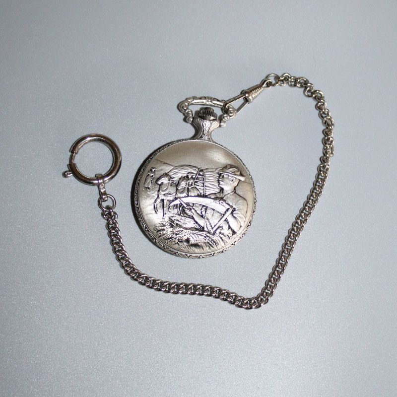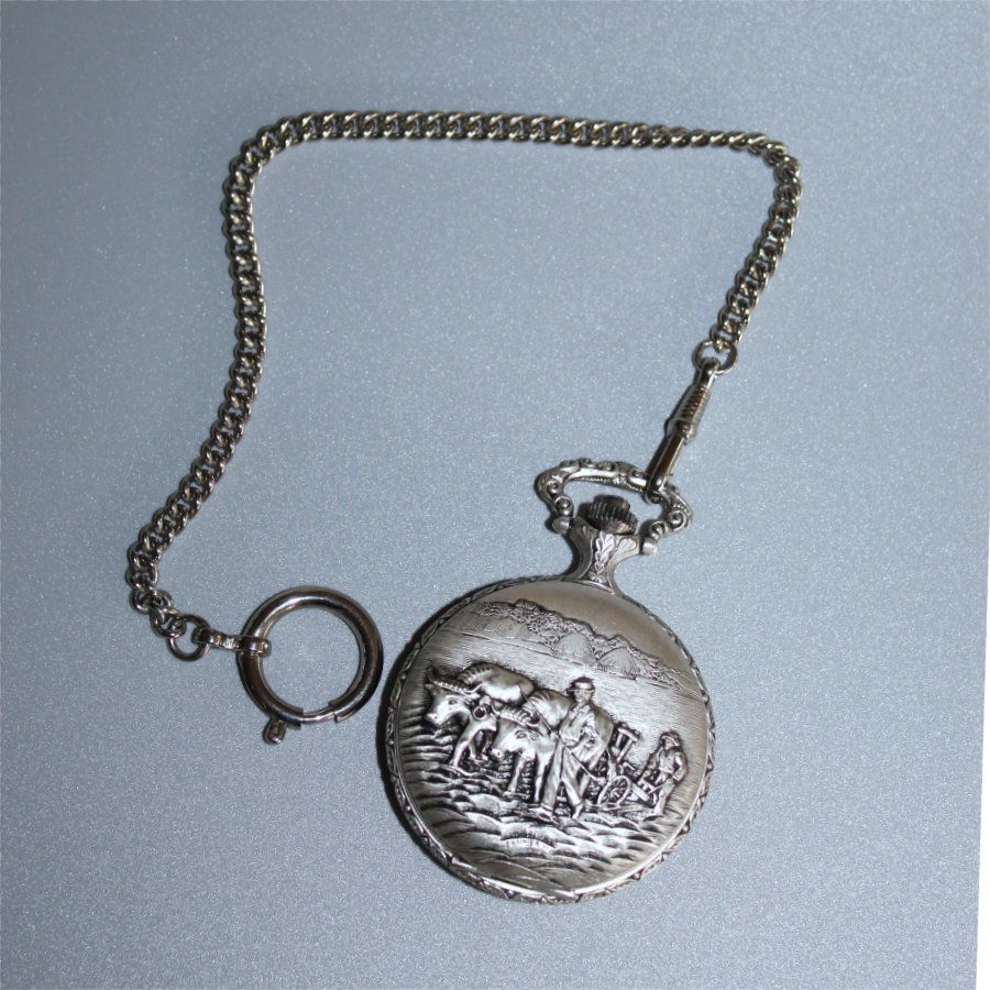 Sujet auf Front Acker mit Pflug & Kühen, Rückseite Bauer mit Sense und Pferdewagen