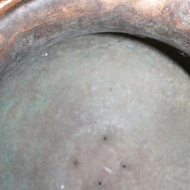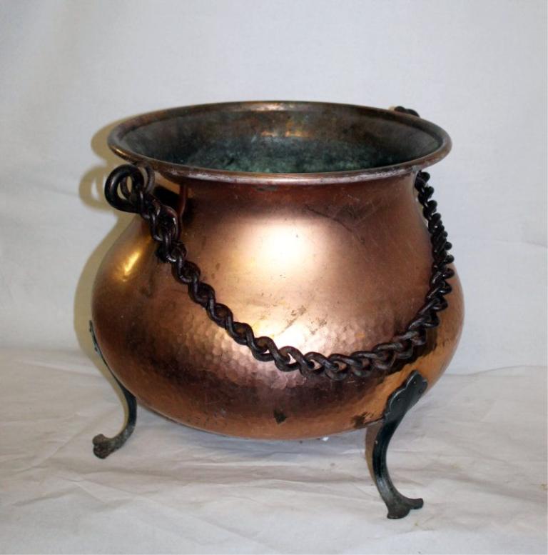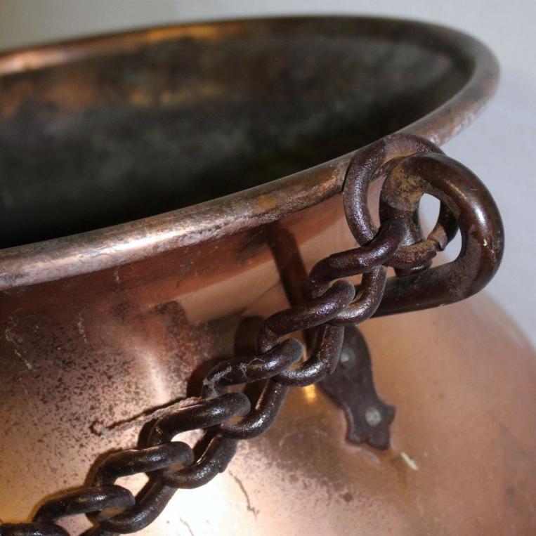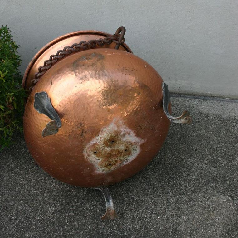 Zustand - Keine Beulen im Kupfer (Foto-Schatten) Kette etwas Rost angesetzt, Kupfer gut - altes Kupfer - hat Auffrischung nötig. Im Boden sind 4 Löcher, damit das Wasser abläuft und keine Staunässe für die Blumen entsteht.