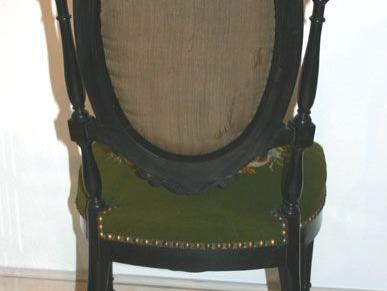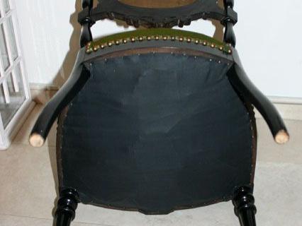 1 kleiner Abschlussteil Lehne oben fehlt (s. Foto), Lehne (Verzapfung muss geleimt werden) renovationsbedürftig