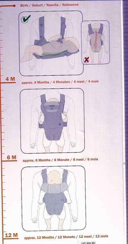 Ab ca. 4 Monaten kann das Baby dann bis zu ca. einem Jahr in der aufrechten Postition getragen werden - dem Träger zugewandt oder auch mit freier Sicht nach vorne.